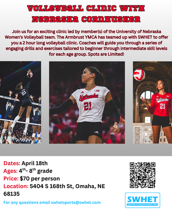 Join us for an exciting clinic led by member(s) of the University of Nebraska Women's Volleyball team. The Armbrust YMCA has teamed up with SWHET to offer you a 2 hour long volleyball clinic. Coaches will guide you through a series of engaging drills and exercises tailored to beginner through intermediate skill levels for each age group. Space is limited to 30 athletes (number of coaches in attendance will be approximately 1:15 ratio).
